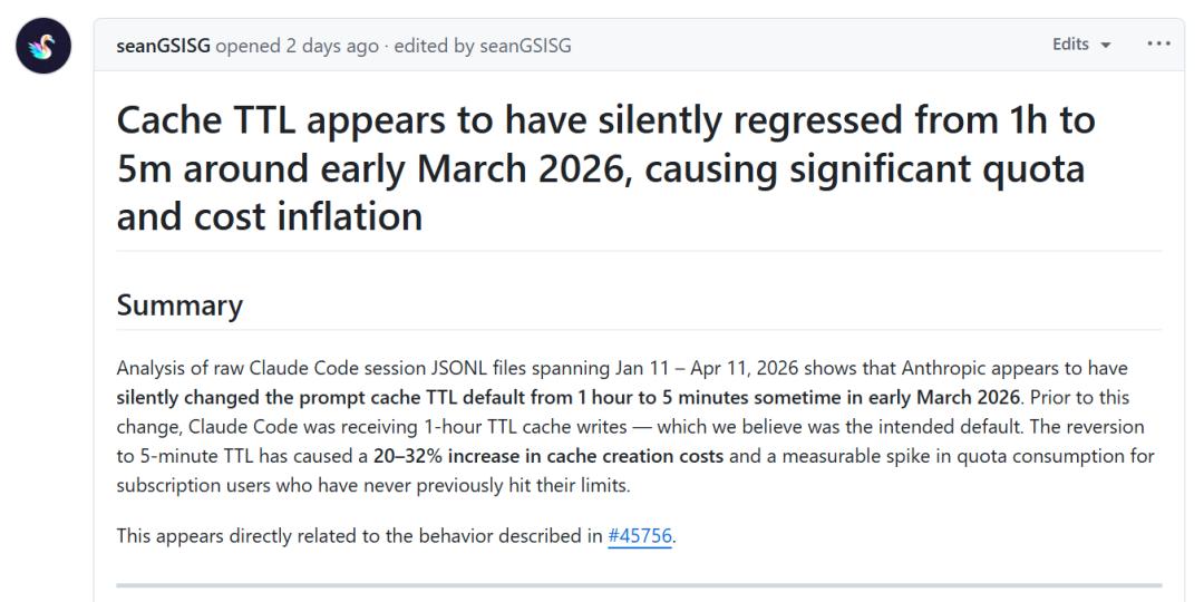 从3月6日至3月8日,Anthropic在没发布任何公告、更新日志和警告的情况下,悄无声息地将API提示词缓存的默认存活时间(TTL)从原本的1小时砍到了5分钟。