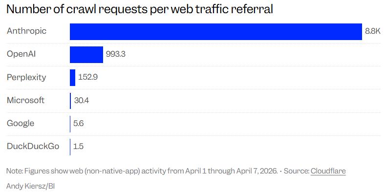 而2026年4月初Cloudflare发布的一份最新数据,无情地揭示了Anthropic主导的一场数据榨取的真相。