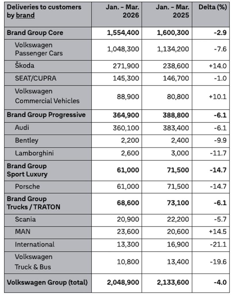 ▲大众汽车集团一季度各品牌销售情况