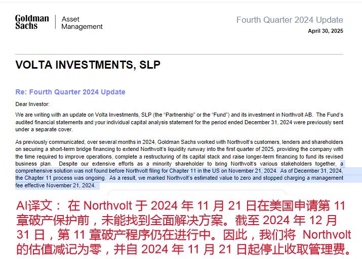 不过,即便专业如高盛,也有“马失前蹄”的时候。据方诚的助理回忆:“今年2月我和高盛的工作人员沟通时,对于Northvolt项目的大亏,高盛一位工作人员回应,这个项目失败的外因,是北极圈冬季几乎无太阳,环境艰难,以及中国企业竞争加剧、欧洲市场萎缩。我们有尝试救这家公司,但最后还是放弃了。所以我们高盛以后要避免去投一些比如能源、电池方面的项目,其实这不是我们高盛的强项。这次对我们来讲是一个很大的经验教训,以后对这些领域要小心谨慎。”