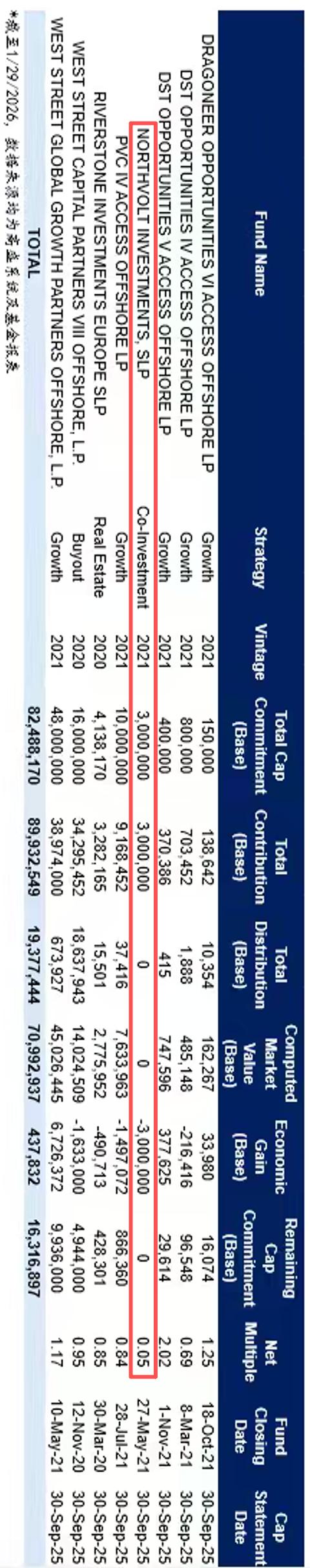 《每日经济新闻》记者注意到,方诚提供的业绩表上,有5只基金被用醒目的黄色高亮标记——这是目前处于亏损状态的产品。其中名为“NORTHVOLT INVESTMENTS, SLP” 的北欧动力电池专项基金:总缴款300万美元,收益为-300万美元,如今高盛已通知估值清零。