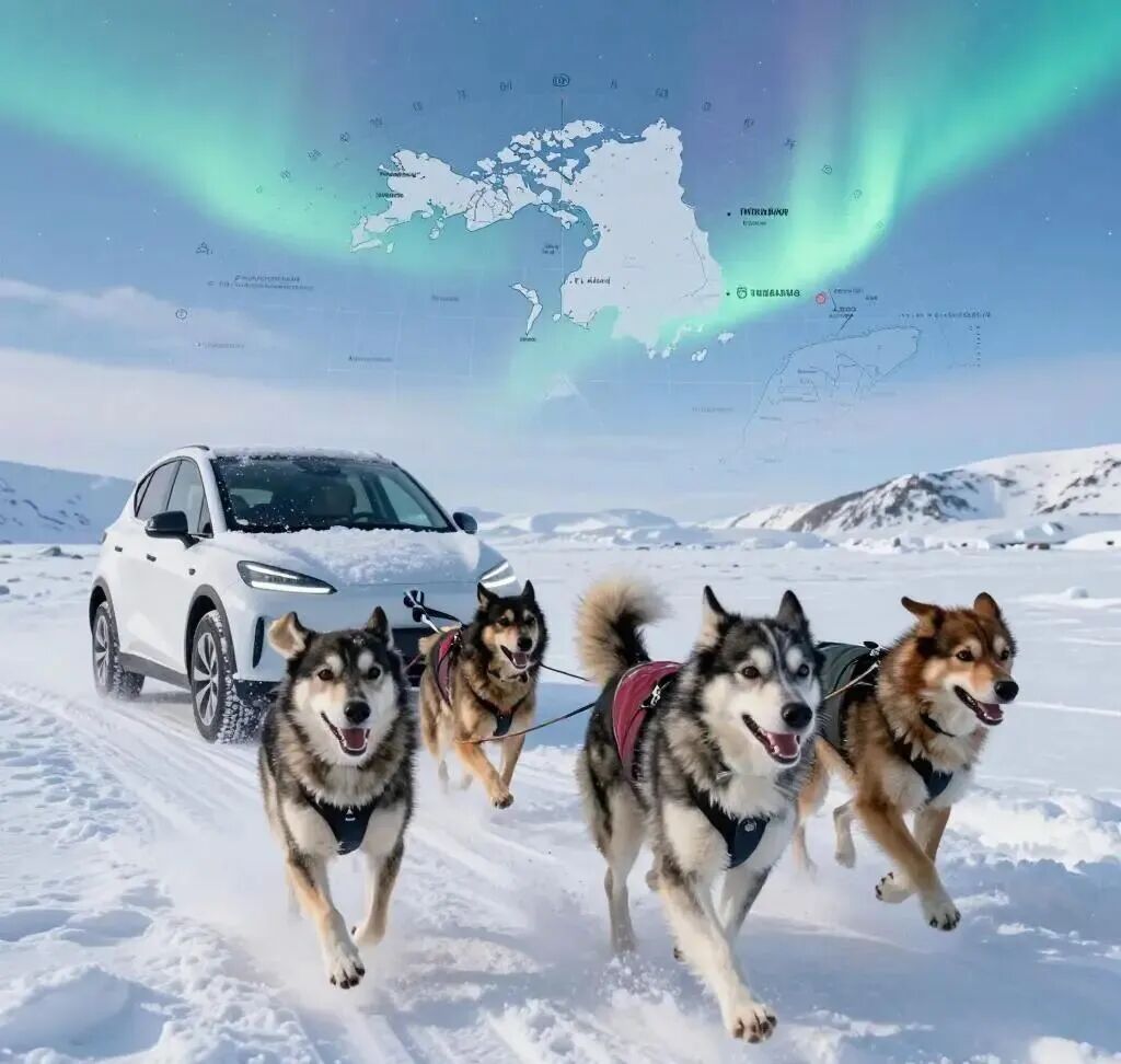 严寒的北极圈冬季几乎无太阳,传统交通工具曾是狗拉雪橇,换成电动车在这里行驶会怎么样?图片来源:AI生成