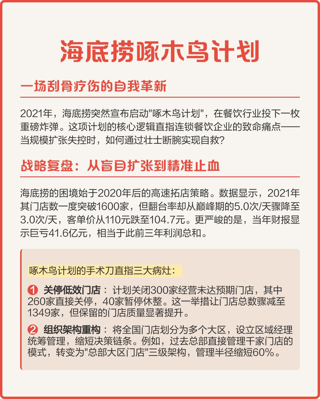 时间倒回四年前。2021年11月,海底捞启动了震惊行业的“啄木鸟计划”,计划在年底前关闭约300家左右门店。
