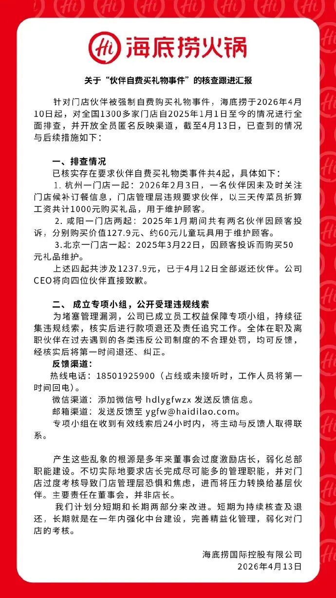 2026年4月13日晚,海底捞国际控股有限公司发布了一份令行业瞩目的公告。在这份关于“员工自费买礼物事件”的核查通报中,海底捞做出了一个在连锁餐饮行业极其罕见的表态:“产生这些乱象的根源是多年来董事会过度激励店长、弱化总部职能建设……主要责任在董事会,并非店长。”