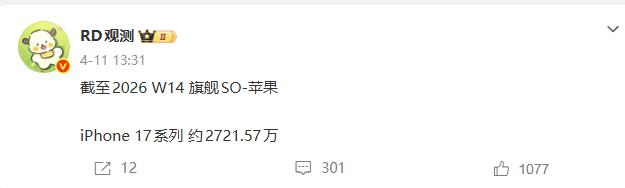 据RD观测发布的最新数据显示:截至2026年第14周(4月6日-4月12日),iPhone 17系列在中国市场累计销量已突破2721.57万台。