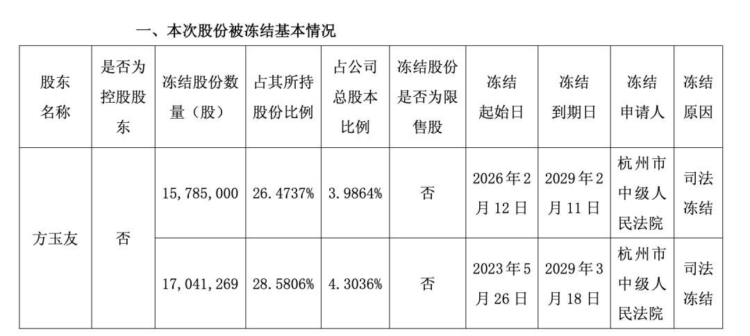根据珀莱雅发布的公告,杭州中院新增冻结方玉友1578.50万股,加上之前已经冻结的1704.13万股,合计3282.63万股被锁死。按现在60块左右的股价,价值大约19.6亿。