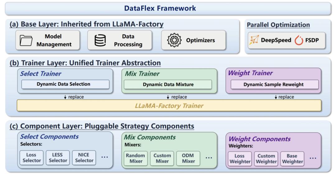 DataFlex 延续了 LLaMA-Factory 易用、清晰的设计思路,但在整体架构上做了关键升级。其在不破坏现有训练生态的前提下,把数据中心训练真正做成了一套统一、可扩展、可复现、可落地的系统能力。整个系统大致可以分为三层: