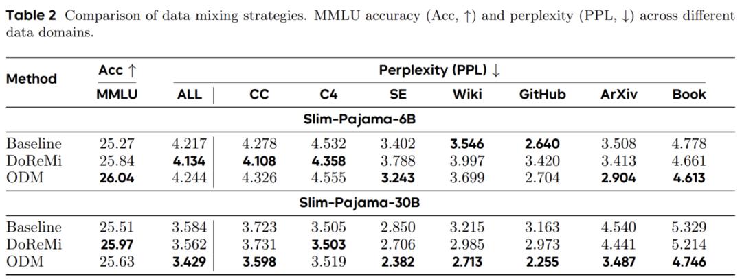 在 SlimPajama 的 6B 和 30B 设置下,DoReMi 和 ODM 两种数据混合算法都表现出了明显优势。在 6B token 规模下,动态数据混合方法已经展现出明显优势:ODM 在通用能力评测中的准确率高于默认静态配比,而 DoReMi 则在整体困惑度上进一步取得更优结果,说明动态调整不同数据域的配比,确实能够带来更好的训练收益。