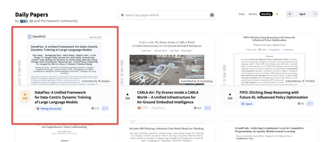 DataFlex 发布后,在 Hugging Face Daily Papers 榜单中迅速获得广泛关注并拿到了月榜第一。这种关注背后所反映的,本质上是社区对「数据中心动态训练」从理论走向工程闭环的里程碑式认可。