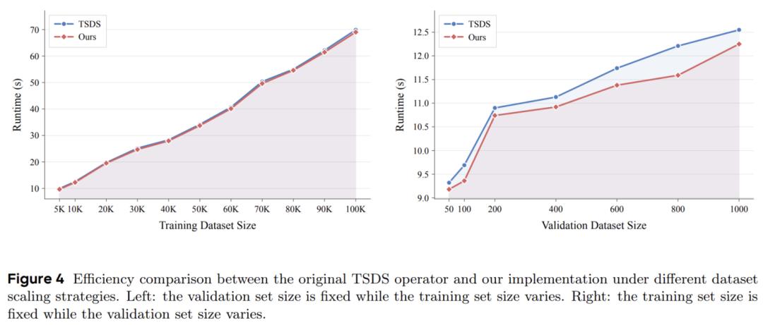 对于 TSDS 这类离线选择方法,DataFlex 的重实现也在不同数据规模下取得了稳定的 1%—3.5% 提速。