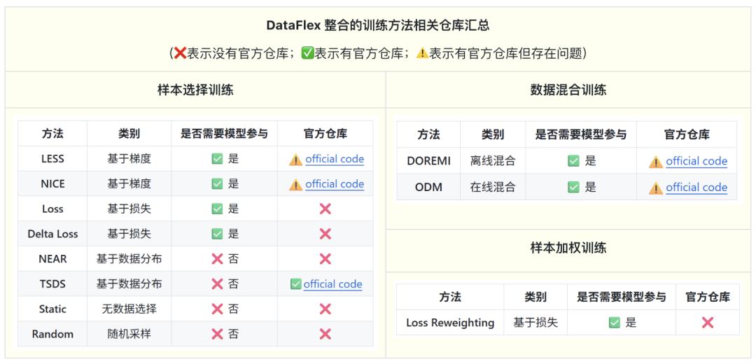 科研上许多极具代表性的动态训练方法,要么缺乏官方仓库,要么其官方实现存在难以复现的问题。DataFlex 通过系统化的重构,让这些处于「失联」或「半停滞」状态的算法重新具备了工业级生产力。