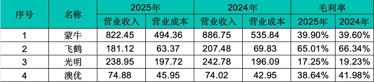 财报显示,2025年飞鹤的整体毛利率从66.34%下降到了65.01%,光明乳业的毛利率从19.23%下降到了17.25%,澳优的毛利率从41.98%下降到了38.64%。