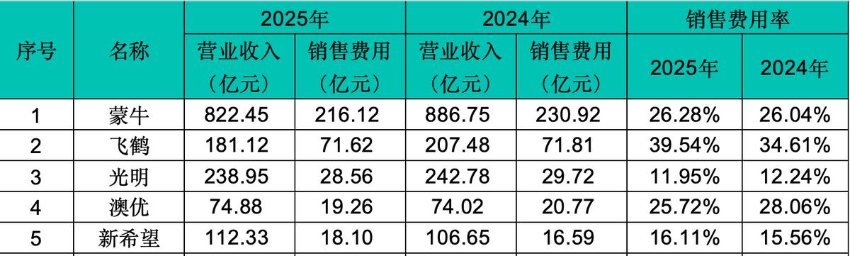 2025年蒙牛、飞鹤、光明乳业、澳优、新希望乳业的销售费用率分别为26.28%、39.54%、11.95、25.72、16.11%。