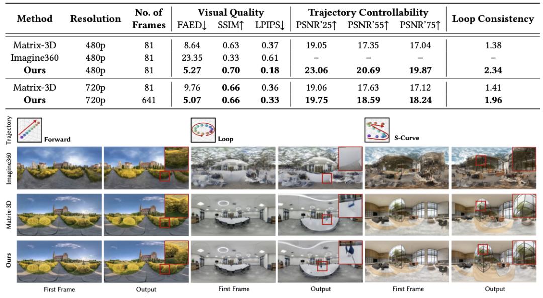 进一步分析显示,全景表示与两阶段生成设计是性能提升的关键,使模型在长视频场景下依然保持稳定与可控。文章重点分析了在长视频(641 帧)条件下不同方法的表现,包括自回归生成与基于透视表示的方法。为了进一步分析长时序一致性,作者设计了闭环轨迹实验,并用 CLIP 相似度衡量模型是否能够 “走回原点”。理想情况下,随着相机逐渐远离起点,相似度应逐步下降;而在轨迹闭环时,相似度应重新上升。相似度在中段下降,在末尾重新回升,说明模型具备较强的长期空间记忆能力。