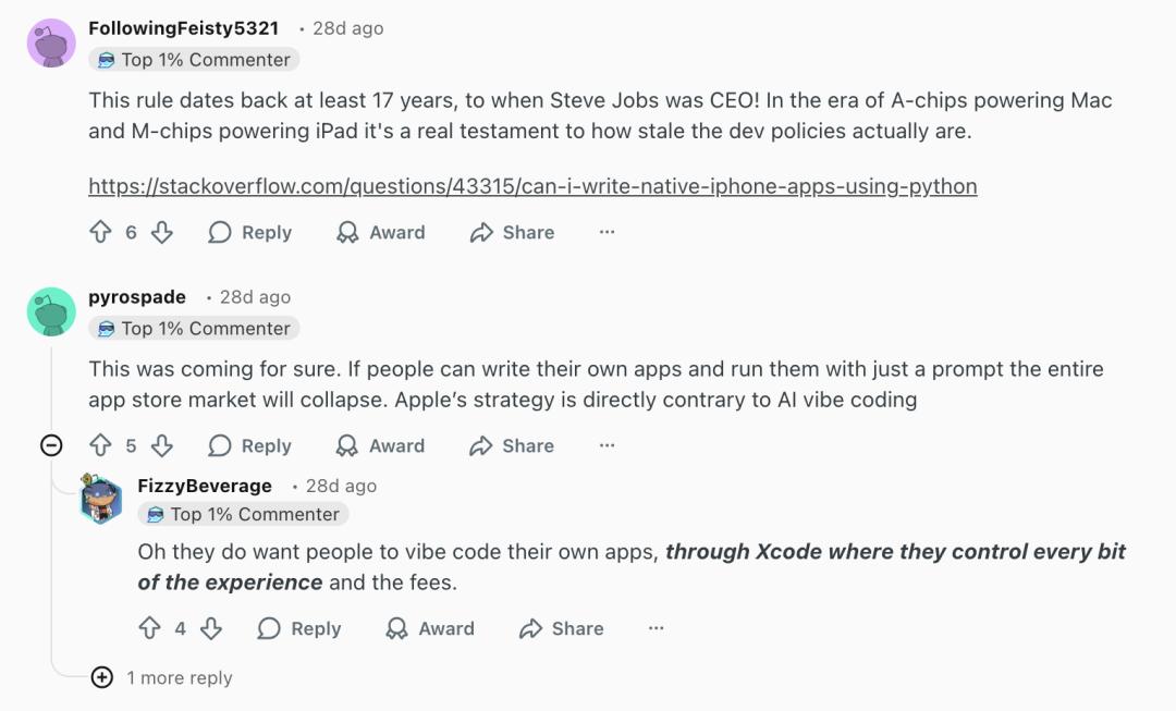 一位用户直接引用了相关规定,指出苹果明确要求应用“不得下载、安装或执行会改变应用功能的代码”,仅对教育类应用设有有限例外。这也成为不少人理解此次事件的出发点——即 Vibe Coding 类应用本质上允许用户生成并运行代码,因此天然处在规则的灰色地带。有评论认为,从这个角度看,这类应用被限制“并不令人意外”,因为“允许在应用内运行自定义代码,一直是被禁止的”。