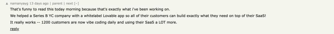 围绕这一趋势,也有开发者分享了实践案例。有评论提到,他们正在为一家完成 B 轮融资的公司构建“白标”Vibe Coding 能力,使其 SaaS 平台的客户可以直接生成所需功能。据称,这一模式已吸引约 1200 名用户每日使用,并显著提升了产品活跃度。这类案例被视为 Vibe Coding 潜在商业价值的直接证明,也强化了“需求已经存在,平台限制难以阻挡”的判断。