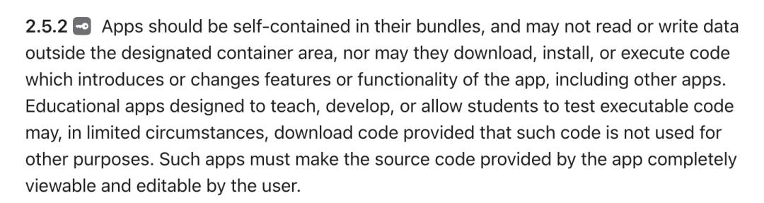 “应用程序应在其软件包内保持独立运行,不得读取或写入指定容器区域之外的数据,也不得下载、安装或执行任何引入或更改应用程序(包括其他应用程序)特性或功能的代码。旨在用于教学、开发或允许学生测试可执行代码的教育类应用程序,在特定情况下可以下载代码,但前提是这些代码不得用于其他用途。此类应用程序必须确保用户能够完全查看和编辑其提供的源代码。”