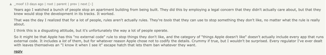套用到这件事上,苹果之所以制定“禁止运行外部代码”的规则,可能只是为了封杀那些他们看不顺眼的东西。而所谓“苹果看不顺眼的东西”,其实并不涵盖所有运行外部代码的应用。虽然被杀掉的应用很多,但由于某种原因,苹果拒绝把这些细节写进明文规定里。如果事实真是如此,那确实很差劲,但我一点也不觉得意外。因为我接触过的每一个监管者,都会给自己留一个“我看一眼就能定罪”的逃生舱,好让他们能随心所欲地查禁任何东西。