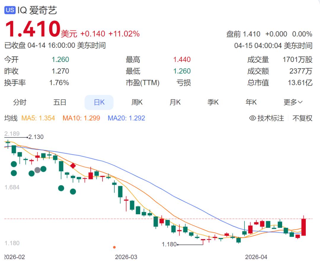 2018年,爱奇艺在美国纳斯达克挂牌上市,发行价每股美国存托股18美元,彼时股价一度超46美元/股,巅峰市值超312.8亿美元。而如今,因无法满足美国《外国公司问责法》的审计要求,爱奇艺已被美国证券交易委员会列入该名单,存在强制退市风险。截至目前,其收盘价为1.41美元/股,市值仅13.61亿美元。