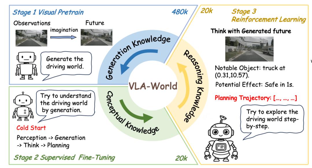 为了打通从感知到预测,再到反思的链路,团队设计了三阶段训练流程。