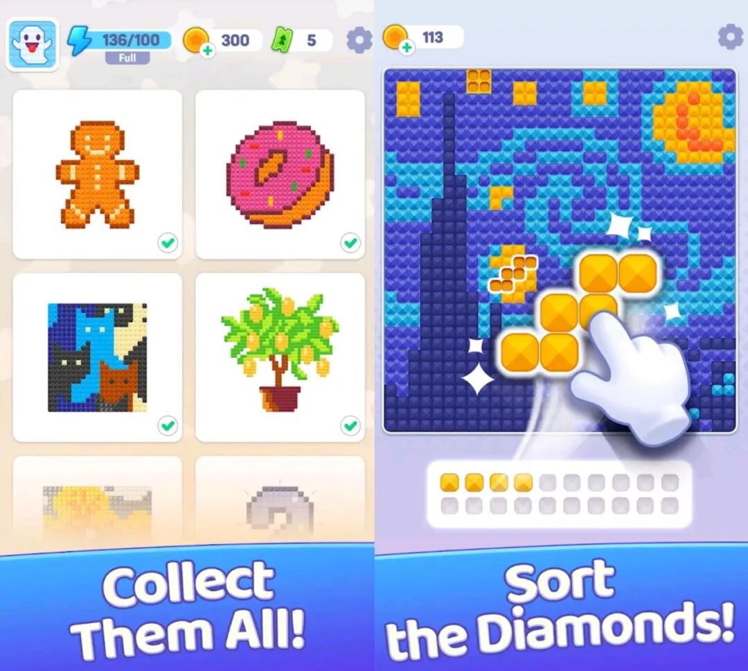 说到这里,可能会有玩家觉得《Jewel Coloring》的玩法有些眼熟:这不就是时下正火的拼豆嘛,只是做成电子版了而已。当然,可能也有人觉得,它其实更像再早一点的钻石画、十字绣之类的游戏。反正这三种手工的共同点都是让豆子/钻石/线落在图纸合适的位置上。