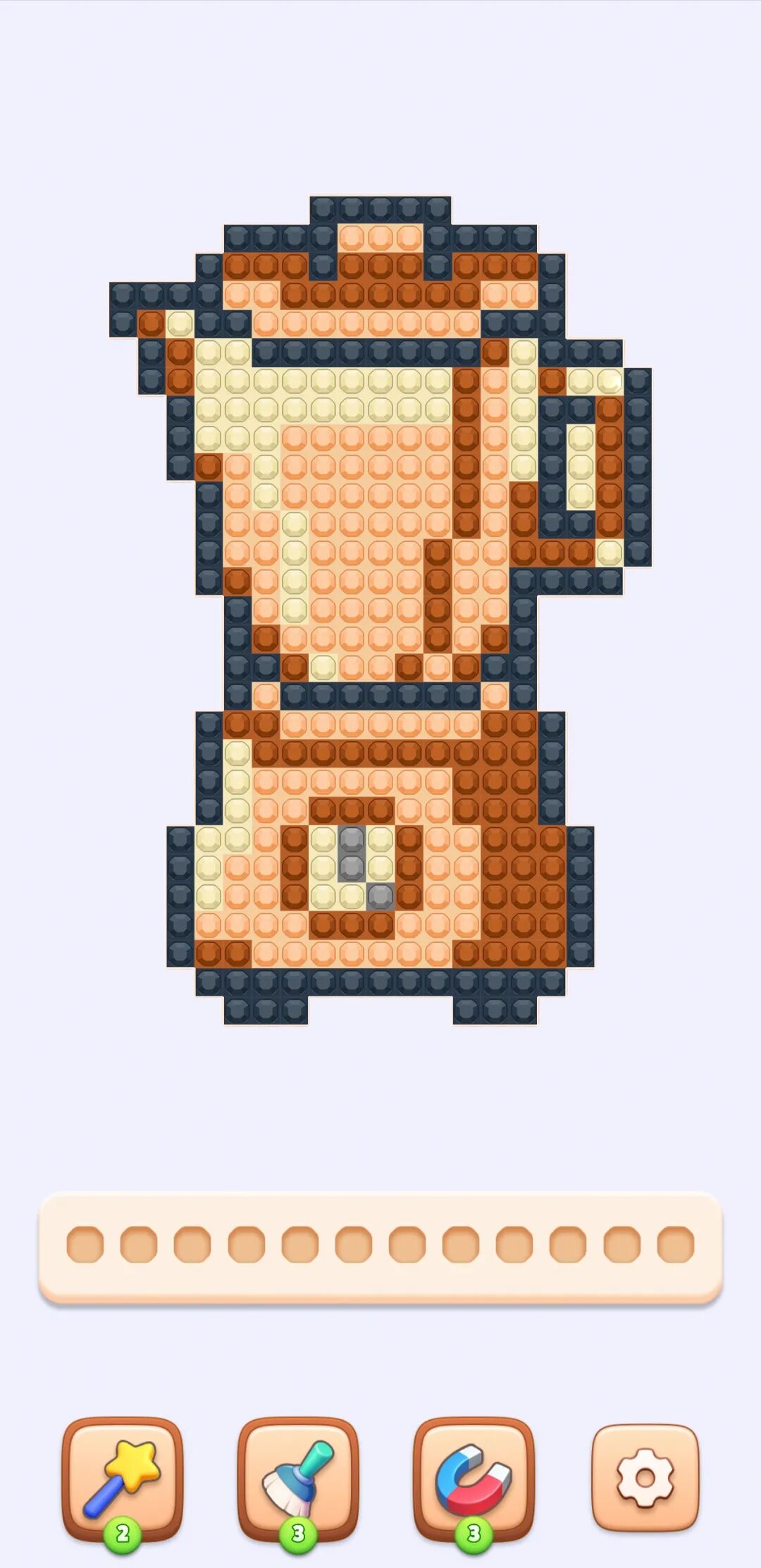 游戏的每一关都是一幅像素风钻石画,只是所有棋子都被打乱了,待在并非相同颜色的位置上。玩家需要做的就是通过点击移动把所有棋子复位,可以利用下方有限的临时存放栏,也可以利用道具,没有固定解法和步骤,反正最后只要复位就算挑战成功。
