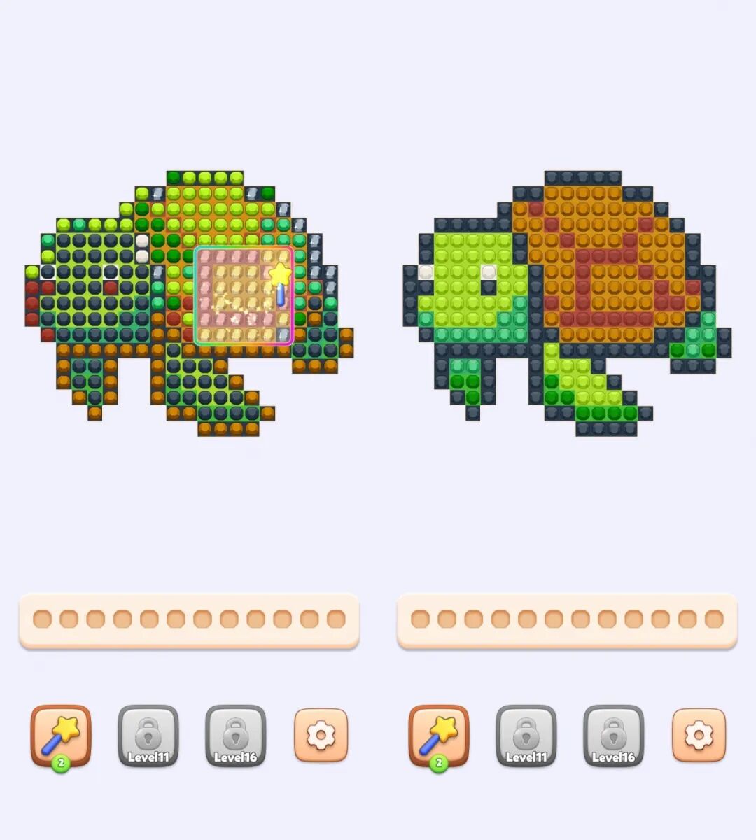 游戏的第一关非常友好,整张画布只有两种颜色,但到了第二关、第三关,游戏的难度可以说是直线飙升,图案复杂度、棋子数量、棋子的颜色相近度都令人眼花缭乱。