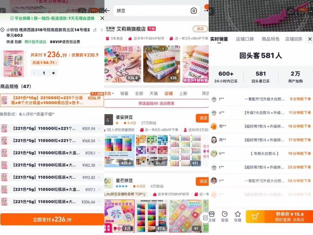在淘宝搜索“拼豆”,你会看到数千家店铺。这个市场的规模很难精确统计,但从几个数据可以窥见一斑:头部店铺的拼豆材料包月销可达数万件;一套完整的“全色号”拼豆套装售价在100-300元之间;而专业的拼豆熨斗、钉板等工具也形成了独立的细分市场。