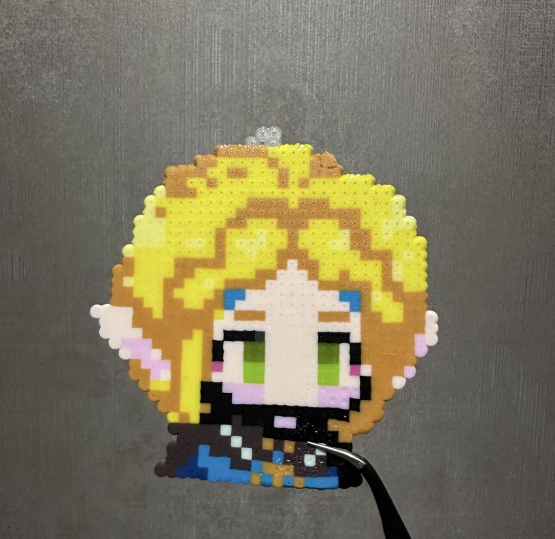 接下来的三个小时里,她一边盯着一张像素图纸,一边用镊子将一颗颗直径5毫米的塑料珠码放在钉板上,直到《塞尔达传说》的主角林克逐渐成型,最后用熨斗一烫,珠子熔合在一起,变成了一个可以挂在包上的挂件。