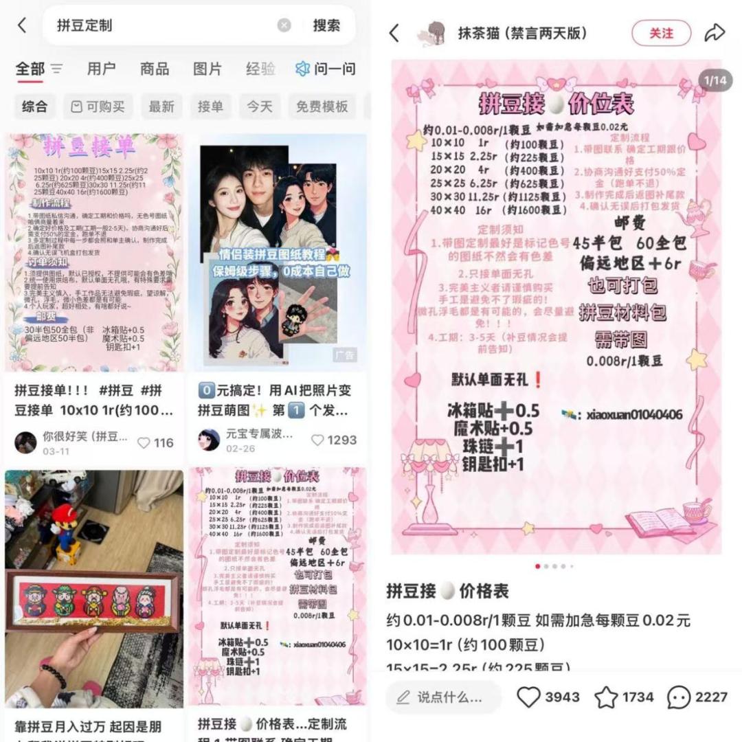 这种价值观的转变也体现在拼豆的传播路径上。与依靠广告投放的传统商品不同,拼豆几乎完全依靠UGC(用户生成内容)传播。小红书上的拼豆笔记、B站上的教程视频、微信群里的作品分享,构成了一个自发的传播网络。在这个网络中,消费者同时也是创作者和传播者,品牌与用户的边界被模糊。