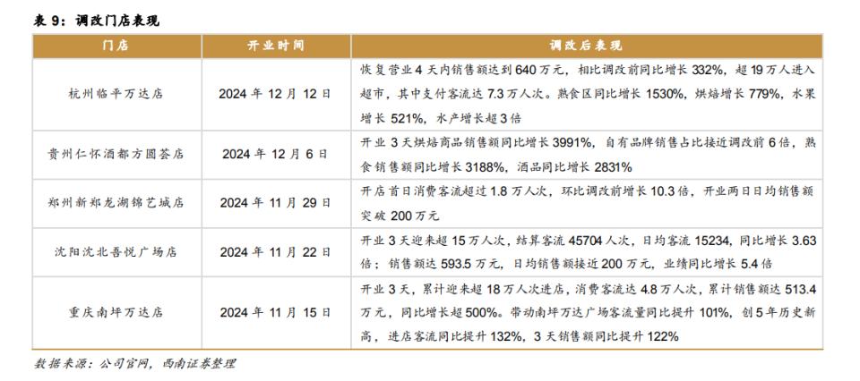 西南证券罗列了部分调改门店的调改前后的对比表现,这些门店恢复营业的头几天均实现了消费客流和销售额的双增,同时更新后的品类尤其是烘焙、熟食等产品销售额均翻几倍增长,甚至带动超市所在商圈的客流和消费的增长,短期效果可谓十分亮眼。