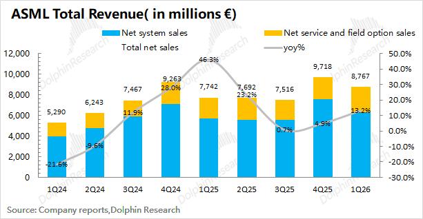 阿斯麦(ASML)的系统销售收入在2026年第一季度实现62.8亿欧元,同比增长9%,本季度主要来自于对韩国客户EUV设备出货的增加。