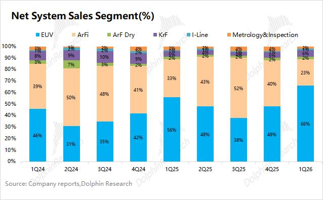 1)光刻系统收入:EUV和ArFi是光刻系统中最主要的收入来源,两项合计占比将近89%。其中EUV本季度收入约为41亿欧元,浸没式DUV-ArFi的收入约为14亿欧元;