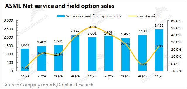 阿斯麦(ASML)的服务收入在2026年第一季度实现25亿欧元,同比增长24%。阿斯麦的服务收入,主要包括设备维护等项目,受行业周期影响较小。
