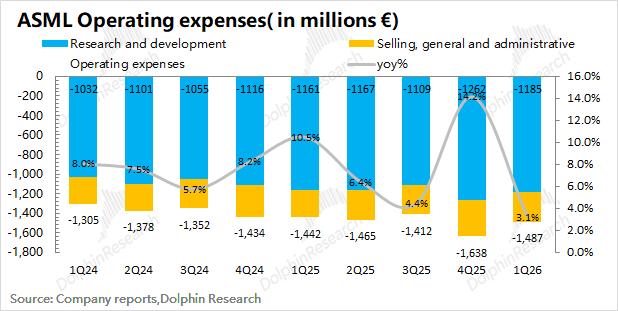 阿斯麦(ASML)在2026年第一季度净利润为27.6亿欧元,同比增长17%,其中公司本季度净利率为31%。其中公司本季度经营费用端有所增长,经营费用率维持在17%左右。
