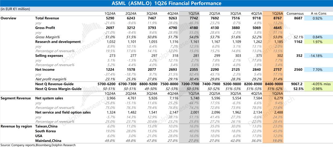 阿斯麦(ASML)于北京时间2026年4月15日下午的美股盘前发布了2026年第一季度财报(截止2026年3月),要点如下: