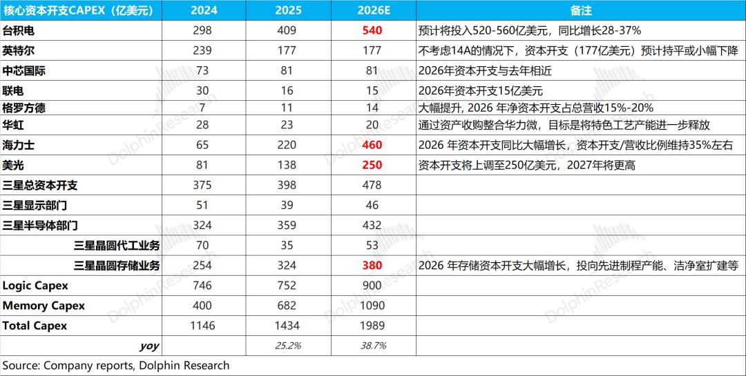 综合核心厂商资本开支的展望,海豚君预估2026年逻辑类厂商的资本开支增速有望达到20%左右;而存储类厂商的资本开支增速将接近于60%。下游资本开支的增长,来自于台积电和存储厂商的加大投资,都是本轮AI Capex的主要受益者。