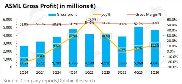 阿斯麦(ASML)在2026年第一季度实现毛利46.5亿欧元,同比增长11%。其中毛利率方面,公司本季度毛利率53%,环比提升0.8pct,达到公司指引区间上限(51-53%),主要是受毛利率相对较高的服务收入占比提升的带动。