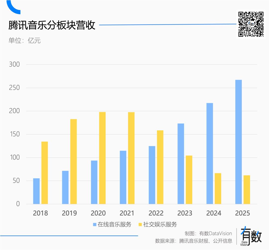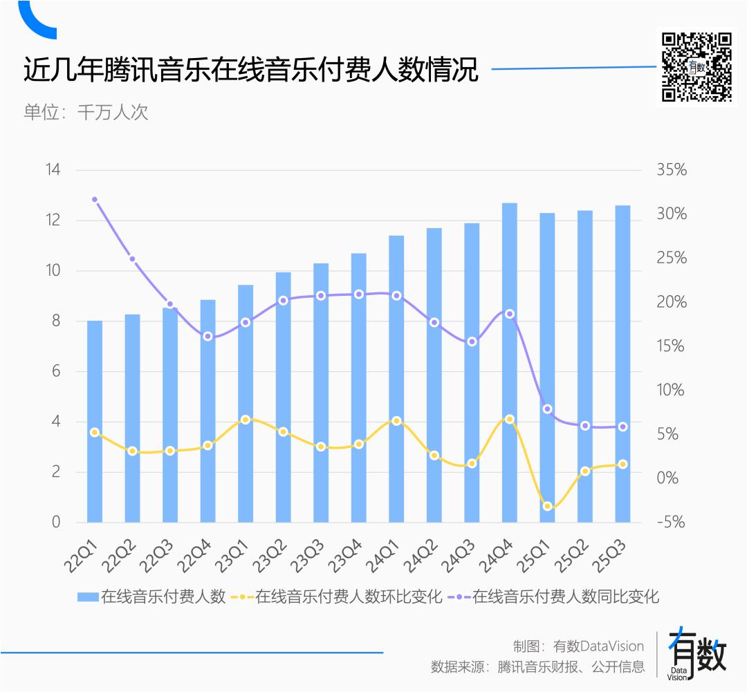 作为在线音乐带头大哥,腾讯音乐旗下涵盖QQ音乐、酷狗音乐、酷我音乐等品牌。2025年营收同比上升15.8%[4]。看上去似乎不错,但细看之下,触顶的趋势同样明显。