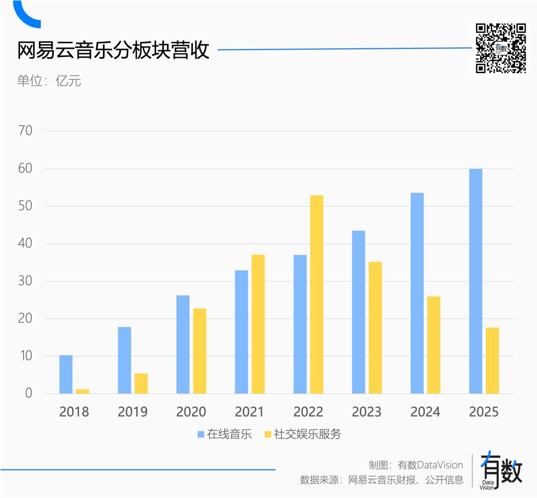 大哥靠着提高客单价维持不错的营收,小弟网易云音乐就艰难很多,2025年全年营收为77.59亿元,同比下降2.4%[2]。