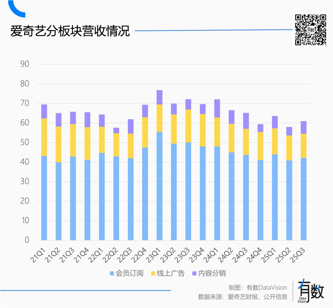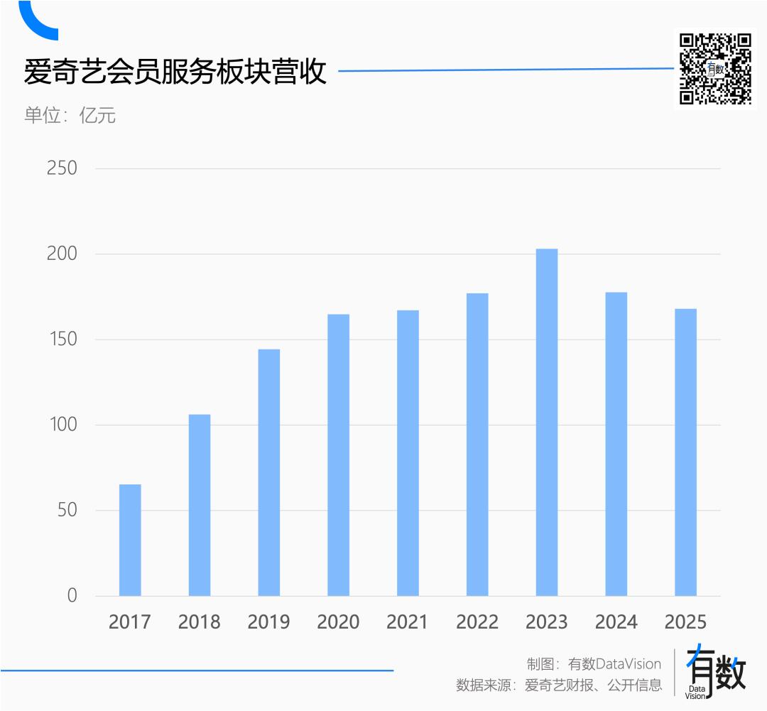2023年后,爱奇艺的财报不再披露月均会员收入。但从整体会员收入来看,经历了2023年《狂飙》的现象级表现,2024/25两年收入都在下滑。