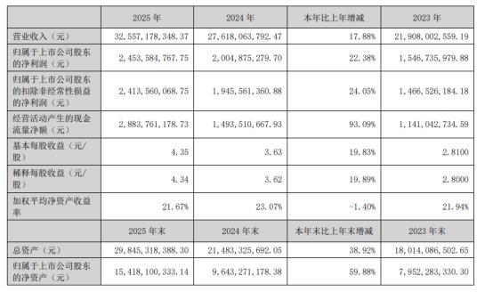 一是,增速放缓的迹象已十分明显。2023年至2025年,公司营收同比增速从46.71%一路下滑至26.06%、17.88%;净利润增速也从30.57%降至22.38%。