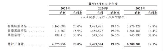 二是,盈利能力的持续下滑。公司整体毛利率从2023年的20.0%降至2025年的19.1%。两大核心业务中,智能座舱业务毛利率从20.0%下滑至18.8%;智能驾驶业务毛利率在2024年短暂回升至19.9%后,2025年骤降至16.4%,同比下跌3.55个百分点。