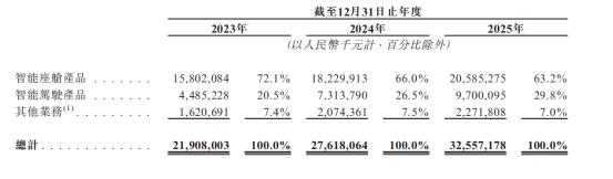 分产品看,智能座舱仍为营收主力但占比持续下滑,从2023年的72.1%降至2025年的63.2%;智能驾驶产品收入则实现爆发式增长,2023-2025年累计增长116.3%,收入占比从20.5%提升至29.8%,成为驱动营收增长的核心动力。