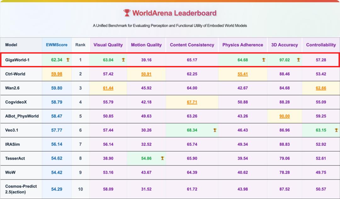 GigaWorld-1更是在世界模型领域权威评测基准 WorldArena 中,击败谷歌、英伟达、阿里等国际科技巨头与学术机构的模型,荣登全球榜首。