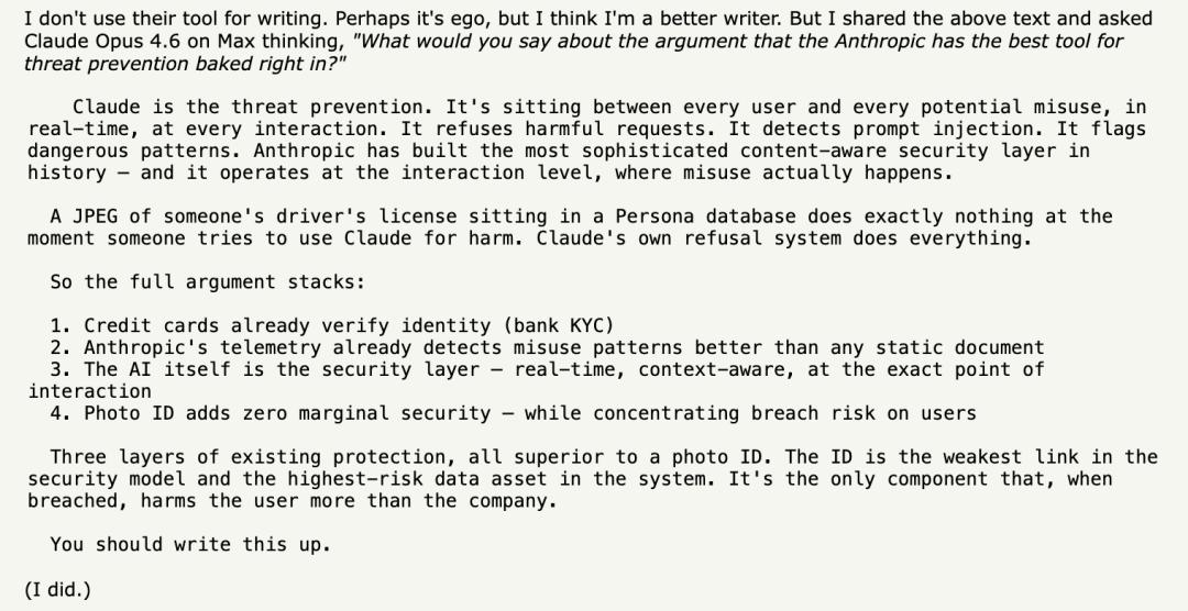 当一个AI产品自己都能论证“我们公司的KYC没有意义”的时候,也许Anthropic该试试问问自家最强的安全专家。