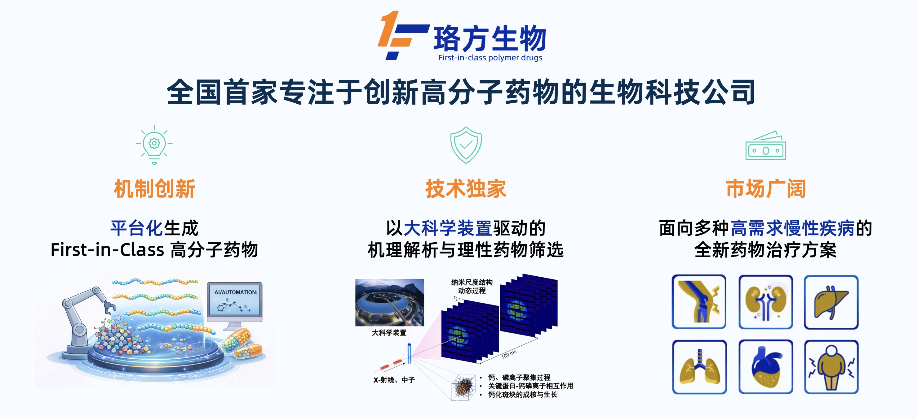 珞方生物依托AI及大科学装置平台化创新能力,聚焦临床尚未满足且需求巨大的慢性疾病领域,开发First-in-class高分子药物
