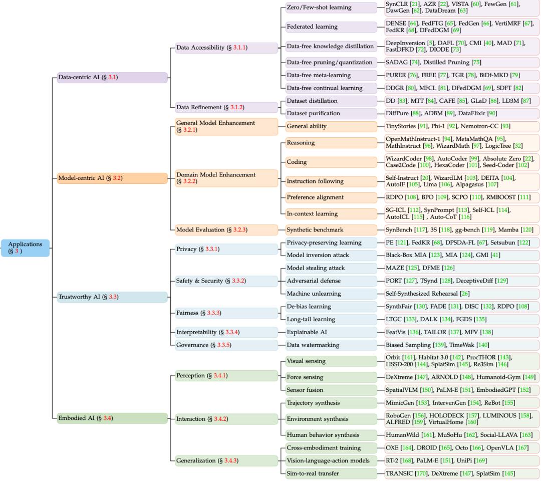 进一步地,随着模型能力的增强,对系统可靠性的需求不断提高,催生了可信人工智能(Trustworthy AI),在这一阶段,合成数据被广泛用于隐私保护、安全防护、公平性提升以及模型可解释性分析。