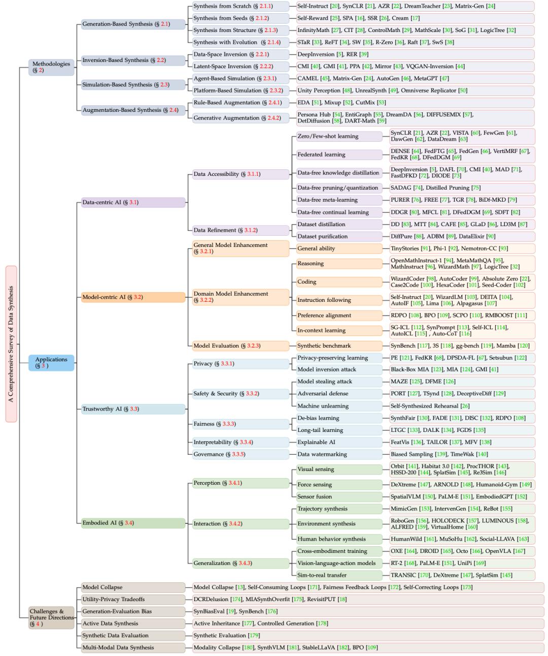 - 在方法层面,多个前沿方向也仍有待探索。例如,主动式数据合成(active data synthesis)强调根据模型需求动态生成最有价值的数据,以提升数据利用效率;而多模态数据合成(multi-modal data synthesis)则关注如何生成语义一致、跨模态对齐的高质量数据,这对于多模态模型的发展尤为关键。