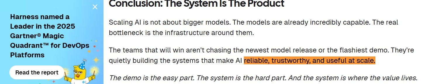 由硅谷连续创业者 Jyoti Bansal 与前苹果 DevOps 技术负责人 Rishi Singh 联合创立的全球头部 DevOps 厂商 Harness,也在官网中提出,客户真正需要的,不是一个能做出演示的模型,而是 “reliable, trustworthy, governed systems at scale”—— 可依赖、可信任、可治理、可规模化的系统。